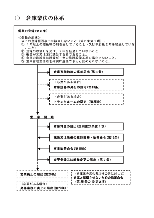 そのため、倉庫業法では「倉庫業を営もうとする者は、国土交通大臣の行う登録を受けなければならない」と規定し、正規に登録を受けた業者による倉庫業の適正な運営と倉庫証券の円滑な流通を確保することとしております。