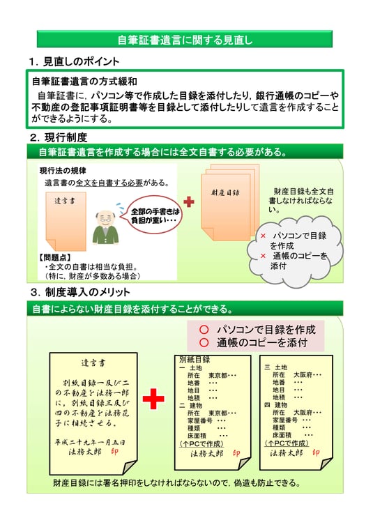これからは、遺言書に添付する「財産目録」については、他人に代筆して貰ったり、パソコン等を使用し作成する方法が認められます。